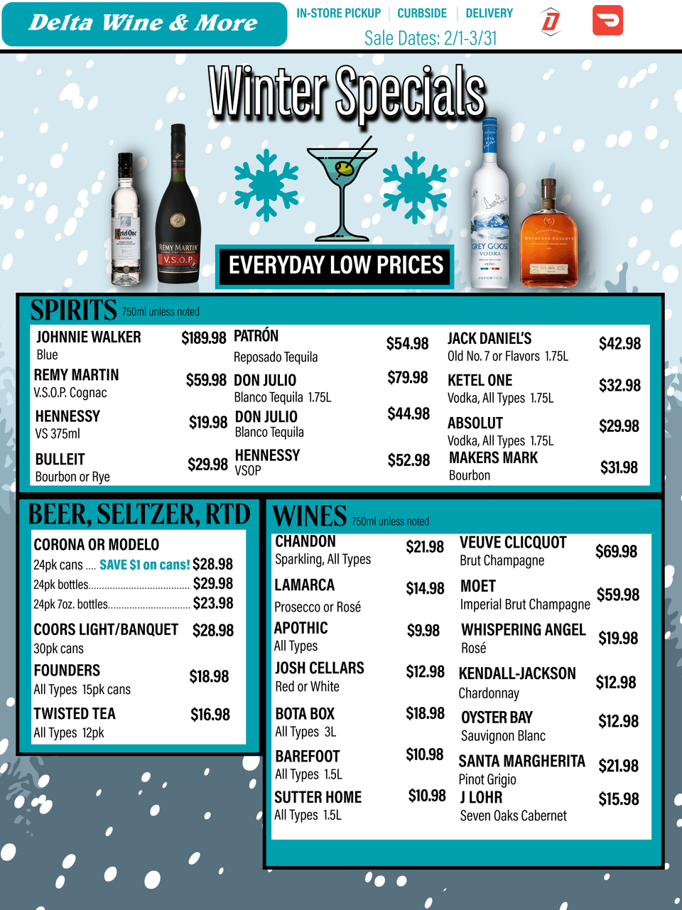 Disclaimer: Delta Wine & More makes reasonable efforts to ensure all information on the website is accurate, however mistakes may happen. Delta Wine & More shall have the right to refuse or cancel any orders placed for products and/or services listed at an incorrect price, rebate or refund, or containing any other incorrect information or typographical errors. Delta Wine & More shall have the right to refuse or cancel any such orders whether or not the order has been confirmed.